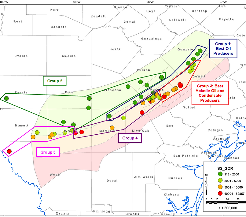 Using mud gas and PVT data, we built curve showing GOR vs. Psat for major plays, helping clients identify areas where pressure has dropped below the bubble or dew point, critical for forecasting production declines and designing artificial life.
